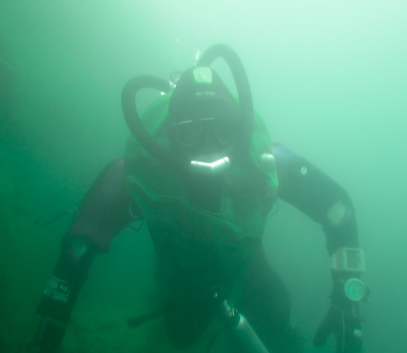 Viditelnost byla vcelku dobrá, tak jsme mohli pozorovat i život pod vodou. Jarda mne zavedl k místu, kde se často zdržuje místní štika a také k vrtulníku Mi-8. Ponor se mi líbil, přístroj Medi 713 je plně funkční, jeho automatika neselhala a udělali jsme potřebné dokumentační snímky na povrchu, na hladině i pod vodou. Cíl tohoto mini retro potápění jsem si splnil. Především jsem získal představu, jak se s tímto přístrojem v hodně dávných časech potápělo a mám fotky do připravovaného článku do časoipisu Dobrá voda.