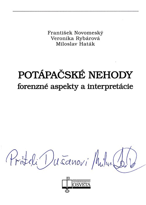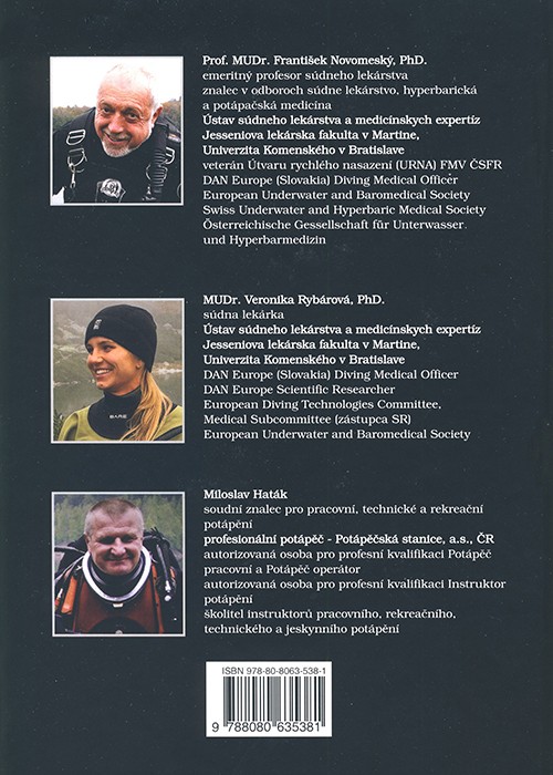 Kniha „Potápěčské nehody, forenzné aspekty a interpretácie“ je první a jedinečné vydání svého druhu, které vychází z odborných vědomostí a rozsáhlého archivu znaleckých posudků dvou soudních znalců MUDr. Františka Novomeského (1947) a Miloslava Hatáka (1957) znalce pro potápěčské práce, bezpečnost práce při potápěčských pracích a při rekreačním potápění. Spoluautorka MUDr. Veronika Rybárová, PhD., soudní lékařka a kvalifikovaná potápěčka, se na monografii podílela hloubkovou analýzou vybraných smrtelných kauz z archivů obou výše jmenovaných koryfejů.