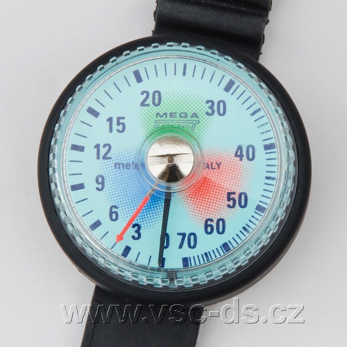 Vysoce přesný náramkový hloubkoměr od italské firmy Mega-Sport, membránový s použitím do hloubky 70m. Standardní ciferník s černým označením hodnot hloubek je na barevném luminiscenčním povrchu. Hloubkoměr je opatřený stavitelnou červenou paměťovou zarážkou pro udávání maximální dosažené hloubky v průběhu ponoru.